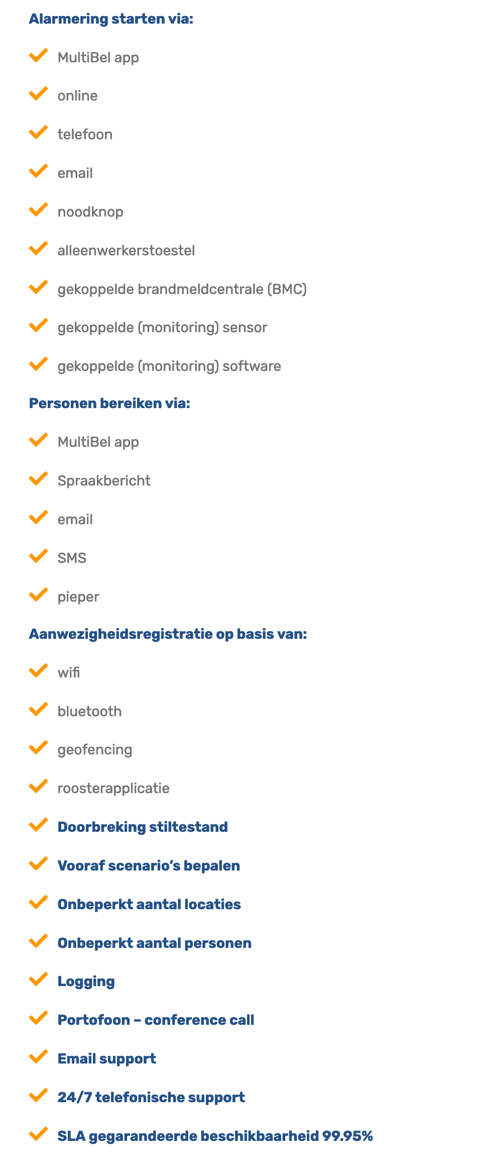 Een scenario starten kan via de app, online, een vaste en mobiele telefoon, een noodknop, een gekoppelde brandmeldcentrale, een storingssensor, software etc. MultiBel Professional wordt modulair opgebouwd om een oplossing op maat te bieden.